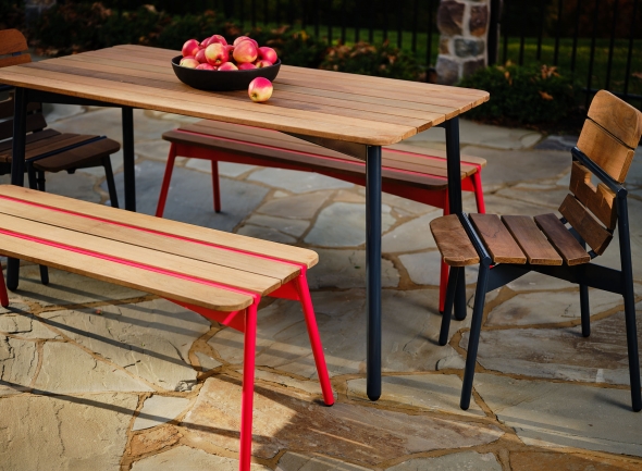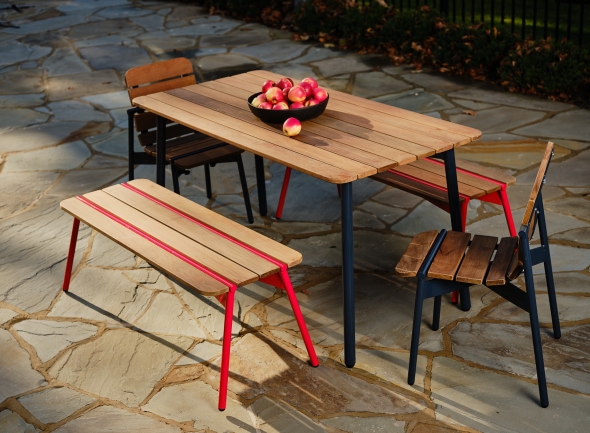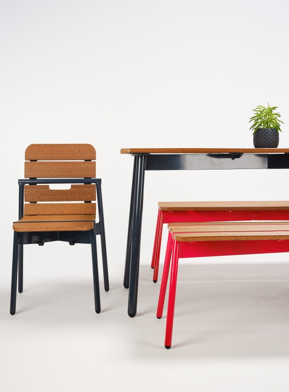 59” STEEL DINING TABLE, WOOD GRAIN RECYCLED PLASTIC